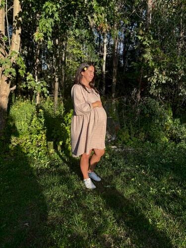 Sherry is wearing a large and is 5'4, 35 weeks pregnant